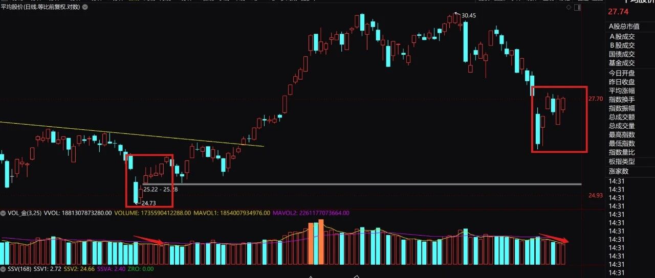 很多人还在预期再次探底,这种可能有没有,当然有,但我更倾向于轻度震荡后连续攀升。 结构大致和11月底那次暴跌之后的走势类似,上图的红框标记,同时成交量萎缩,最后通过突破25日均量线证明情绪回归。 总体来看,是低吸的黄金阶段。 暴跌前的领涨股,很多呈现快速缩量回撤,波动率趋于安静,缩量过2/3,回撤幅度在30%以内,有色类的回撤大一些(有色一向如此,上轮牛市中也是 这样),这是基底最大回撤结构形成的节奏。当然,后续走势如何发展,基底形状会走成啥样,是无法预测的,不同行业不同个股都有自己的个性。重要 的不是形状,而是方向。 TR情绪指标的白色线,理论上第一次冲高会返回沸腾区,完成一个短周期情绪循环。 ...