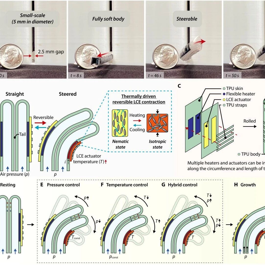 在医疗介入、工业检测等对操作精度要求极高的领域,机器人常需在高度受限且敏感的环境中执行任务,其核 心挑战在于如何实现低环境干扰与高路径适应能力。以血管介入手术为例,器械往往要在直径仅数毫米的血管 中穿行,且必须将对血管壁的压力严格控制在安全阈值内。早期的连续体机器人虽借助柔性主干实现形变导 航,但其推进方式多依赖基座驱动,行进过程中易对管壁产生法向力和剪切力。同时,为承受轴向推力,机器 人需维持一定刚性,这限制了其在毫米级尺度下的进一步微型化。 相比之下,柔软机器人借鉴了自然界生物的运动机制,采用柔韧材料与创新驱动方式实现移动。其中,外翻机 器人作为一种特殊构型,其运动过程类似于将袜子从里向外翻转 —— 通过材料外翻实现从尖端延伸身体,而 非从基座推动前进。 这种运动方式带来两大核心优势: 一是显著降低了机器人本体与环境的交互作用 ,减少了移动过程中的碰撞 与摩擦; 二是实现机器人身体始终沿尖端已探明路径前进 ,特别适用于管道、洞穴或人体血管等约束空间内 的穿行任务。 然而,尽管外翻机器人在被动顺应环境方面表现优异,其在复杂结构中的主动转向问题长期以来悬而未决。现 有转向机制,例如气动人工肌肉或肌腱牵引,往往 ...