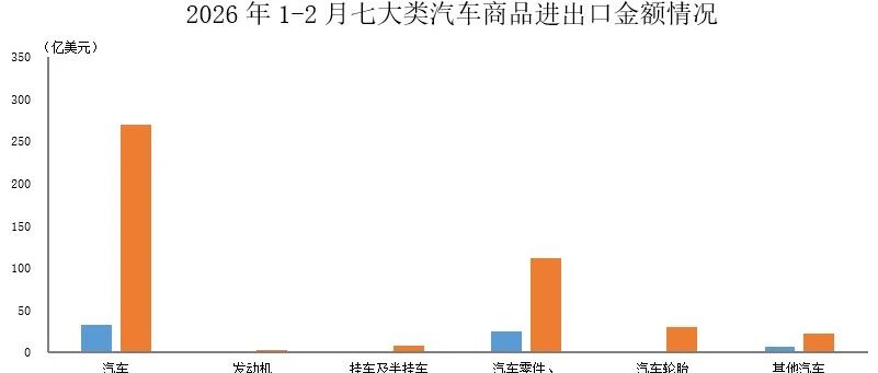 2026年2月中国汽车商品进出口总体情况 - 2026年2月汽车商品进出口总额为238.4亿美元,环比下降12.9%,但同比大幅增长45.5% [2] - 2026年1-2月累计进出口总额为512.0亿美元,同比增长36.1% [2] 2026年2月中国汽车商品进口情况 - 2026年2月进口金额为29.4亿美元,环比下降19.3%,同比下降12.5% [2] - 2026年1-2月累计进口金额为65.9亿美元,同比增长7.7% [2] 2026年2月中国汽车商品出口情况 - 2026年2月出口金额为209.0亿美元,环比下降11.9%,同比大幅增长60.5% [2] - 2026年1-2月累计出口金额为446.1亿美元,同比增长41.6% [2]