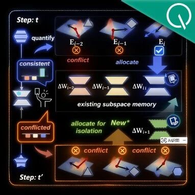 文章核心观点 - 北京航空航天大学团队提出了一种名为CASE的新型大语言模型终身编辑框架,旨在解决模型在持续学习新知识时面临的“灾难性遗忘”与“参数爆炸”两大核心困境 [1] - CASE框架通过“冲突评估分配”与“知识敏感神经元调优”两大核心技术,实现了在千次连续知识编辑后仍能保持高准确率与参数高效性,为AI模型在需要持续更新知识的实际场景中部署提供了潜在解决方案 [1][3][29] 技术原理与核心突破 - **核心困境**:现有终身模型编辑方法存在“盲目加参数”和“无差别调参数”两大问题,导致要么计算资源占用过大,要么因梯度冲突累积而产生严重遗忘 [4] - **冲突评估分配模块**:该模块通过计算新知识与已有参数子空间更新方向的余弦相似度来量化“编辑冲突”,并据此决定新知识是共享现有子空间还是新建子空间,从而从根源上避免冲突知识相互干扰并控制子空间数量 [8][9][11][12][13][14][15] - **知识敏感神经元调优策略**:该策略利用Fisher信息矩阵识别对当前知识最敏感的“关键神经元”,并仅对这些神经元进行精准更新,同时通过知识激活正则化约束,确保历史知识不被破坏,从而消除局部参数更新冲突 [16][17][18] 实验性能与效果 - **编辑准确率领先**:在ZsRE数据集上进行1000次连续知识编辑后,CASE在LLaMA2-7B模型上的平均准确率达到**92%**,比次优方法高出近**10个百分点**,且泛化性达**82%** [20][21][24] - **有效修正幻觉**:在SelfCheckGPT幻觉修正任务中,经过1000次编辑,CASE使LLaMA2-7B的困惑度从**3.12**降至**1.22**,比次优方法低**60%**,并能稳定维持低困惑度 [20][22] - **参数与效率优势显著**:CASE框架的额外参数占用**不到1MB**,远低于WISE方法所需的**86MB**,推理时每迭代耗时仅**10.72秒**,与未编辑模型几乎无差异,具备实际部署的可行性 [2][23] 应用前景与意义 - **解决行业刚需**:在金融、医疗、法律等知识需要持续更新的领域,CASE提供了一种无需全量微调、效果稳定的轻量级模型更新方案,可应对医疗指南更新、法律条文修订等场景 [28][29] - **技术特性适配**:该框架支持千级别的连续编辑,兼容LLaMA、Qwen等主流开源大模型,迁移成本低,为模型的“终身学习”能力提供了更优解 [30] - **未来发展方向**:团队计划进一步探索CASE在多模态模型和非结构化数据编辑中的应用,以覆盖更多实际场景 [31]