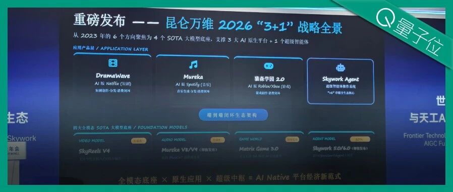 文章核心观点 - 行业正经历从大模型工具时代向AI平台经济时代的第二次跃迁 [3][4] - 天工AI的战略目标不是单纯打造更强的模型,而是构建一套完整的AI原生平台 [2][8] - 公司通过发布三大SOTA模型,正在拼凑一个“可理解、可生成、可交互”的世界模型雏形,并以此为基础搭建平台生态 [13][82][105] 天工AI的战略与平台愿景 - 公司提出“3+1”生态架构作为其2026年AGI战略升级,底层是四大SOTA模型(视频、音乐、游戏世界模型及Skywork 6.0),上层是三大AI原生平台经济体,并由Skywork Super Agents作为通用操作系统 [82][83][84][85][86] - 平台包含内外两层:内层是从技术到模型再到应用的完整闭环;外层是由开发者、创作者和合作伙伴加入后演化而成的生态 [9] - 公司的路径是先拿下“全模态”能力,再向平台延伸,与“先搭台、后唱戏”的传统路径相反 [119][123] 三大模型发布与技术进展 - **游戏世界模型Matrix-Game 3.0**:解决了长时序一致性与高分辨率实时生成两大难题,模型长期记忆能力达到分钟级,并在720P分辨率下,5B模型实现最高40FPS的实时生成 [19][20][27][29] - **视频大模型SkyReels V4**:在Artificial Analysis文转视频(含音频)全球榜登顶,解决了音画不同步、可控性差、缺叙事逻辑、商用落地难四大顽疾,通过自研对称双流MMDiT架构、全模态参考、强化学习与阶梯式课程学习提升能力,最终在保证1080P、32FPS、15秒成片质量的同时,将计算成本压至原来的三分之一 [42][43][44][53][58] - **音乐大模型Mureka V9**:其前代Mureka V8已登顶Artificial Analysis音乐模型榜,超越Suno V4.5、Udio v1.5 Allegro等国际主流模型,V9在段落内文本控制、生成效率、混音质量与整体听感上进行了全方位打磨 [68][66] 世界模型的构建路径 - 三大模型并非孤立推进,而是互相配合、彼此反哺:Matrix-Game系列构建可实时交互的世界框架,SkyReels系列承担对世界的理解与预测,Mureka系列补齐表达与情绪维度 [13][77] - 世界模型的核心在于学习状态转移参数,具备动态性、可交互性和物理一致性,从“视频生成器”转变为“可交互系统” [32][39] - 实现世界模型需要数据引擎、模型架构、推理部署三个层面的系统性升级 [33] 产业趋势与商业化落地 - AI正从“辅助工具”进入生产流程本身,开始“主导”部分生产环节,这要求能力从单点转向体系化 [92][100] - 公司模型已在具体平台落地:游戏世界模型驱动新一代AI开放世界模拟游戏平台“猫森学园”;视频模型驱动海外付费短剧平台DramaWave(“AI版Netflix”);音乐模型驱动AI音乐创作与分发平台Mureka(“AI版Spotify”) [97] - 产业一线人员(如游戏开发者、音乐人、导演)的实践表明,AI正在压缩传统高成本、耗时的创作环节,并降低创作门槛,但专业创作者面临的挑战是让AI理解专业语言 [93][94][95][96] 行业竞争格局与公司定位 - AI行业竞争分两条路径:一类在单一模态卷极致(如Midjourney、Sora);另一类尝试整合多模态能力构建统一系统或平台,后者更难且玩家寥寥 [109][110][112] - 天工AI作为后者,其转向平台标志着全球第一梯队迎来了一位“全能”国产玩家,竞争焦点可能从单点能力转向体系化能力 [107][108] - 母公司昆仑万维自2022年“All in AGI与AIGC”以来,已构建“模型+产品”完整矩阵,其海外服务覆盖全球100多个国家和地区,全球平均月活跃用户近4亿,海外收入占比达92% [114][117]