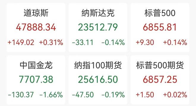 美股市场整体表现 - 截至北京时间12月9日23:00左右,美股主要指数涨跌不一,道琼斯指数报47888.34点,上涨149.02点,涨幅0.31%,标普500指数报6855.81点,上涨9.30点,涨幅0.14%,纳斯达克指数报23512.79点,下跌33.11点,跌幅0.14% [1][2] - 主要股指期货表现分化,纳斯达克100期货报25616.50点,下跌47.50点,跌幅0.19%,标普500期货报6857.25点,上涨1.50点,涨幅0.02% [2] - 反映中概股表现的纳斯达克中国金龙指数报7707.38点,下跌130.37点,跌幅1.66% [2] 科技股与半导体板块 - 科技股多数下跌,闪迪股价下跌约4.5%,迈威尔科技股价下跌近3% [2] - 美股科技七巨头涨跌不一,脸书股价下跌1.5%,领跌该板块 [2] - 部分半导体及科技公司股价显著下跌,ASTERA LABS股价下跌5.74%,NAVITAS SEMICONDUCTOR股价下跌5.21%,CREDO TECHNOLOGY股价下跌4.56%,闪迪股价下跌4.41%,艾马克技术股价下跌3.33%,迈威尔科技股价下跌2.80% [3] - 英伟达股价盘前冲高2%后回落,开盘后下跌近1% [4] 特斯拉与机器人产业链 - 特斯拉股价开盘后大幅拉升,截至发稿上涨超过1% [3] - 特斯拉当前股价为444.206美元,成交量为1204.2万股,总市值为14773亿美元 [4] - 据21世纪经济报道,特斯拉人形机器人团队在中国进行“审厂”的消息频传,业内人士称此举可能是为配合明年一季度特斯拉Optimus Gen3机器人的发布进行量产准备,意味着特斯拉机器人产业链在近两年的“送样”和“测试”后,或将迎来落地时刻 [3] 中概股表现 - 热门中概股普遍下跌,纳斯达克中国金龙指数一度下跌2% [4] - 趣店股价下跌超过7%,亿咖通科技和文远知行股价下跌超过5% [4][5] - 贝壳、理想汽车、百度、哔哩哔哩股价跌幅在4%上下,小鹏汽车股价下跌超过3%,阿里巴巴和京东股价下跌超过1% [4] - 具体跌幅方面,趣店下跌7.30%,亿咖通科技下跌5.70%,文远知行下跌5.41%,贝壳下跌4.39%,理想汽车下跌4.18%,百度集团下跌3.97%,小鹏汽车下跌3.58% [5] 大宗商品市场 - 国际贵金属价格剧烈波动,COMEX黄金期货一度失守4200美元/盎司大关,随后震荡回升,截至22:46报价4221美元/盎司,现货黄金报4203美元/盎司 [5] - 白银涨幅明显,现货白银和COMEX白银价格均上涨超过1.4% [5] - 原油和天然气期货价格持续下挫,其中NYMEX天然气期货价格一度下跌超过6%,目前下跌约4% [7] 宏观经济与政策背景 - 美国10月职位空缺数从前一个月的766万小幅增至767万,为五个月来最高水平,高于经济学家预期的712万中值,可能缓解对劳动力市场出现更明显恶化的担忧 [7] - 2025年美联储最后一次议息会议即将来临,根据CME FedWatch数据,市场目前押注FOMC在12月会议上降息25个基点的概率约为87%至89%,显著高于一个月前 [8] - 斯巴达资本首席经济学家Peter Cardillo表示,美联储的降息预期叠加12月历来是股市表现较强的月份,使得市场进入了典型的“圣诞行情” [8] - 对于贵金属市场,Peter Cardillo预测今年年底黄金和白银将会有相当稳健的表现,黄金年底目标价可能会接近4500美元/盎司左右 [8] - 据新华社报道,美国总统特朗普表示美国将允许英伟达向中国“经批准的客户”出售H200人工智能芯片,芯片销售收入的25%将上缴美国政府 [4]