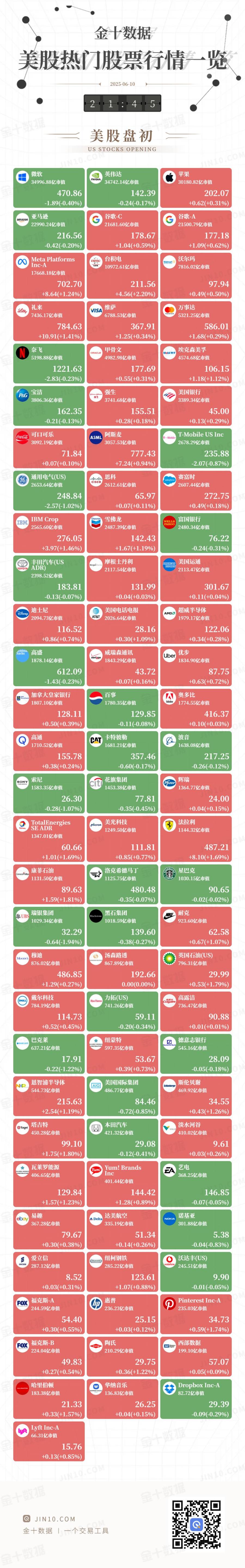 金十图示:2025年06月10日(周二)美股热门股票行情一览(美股盘初)