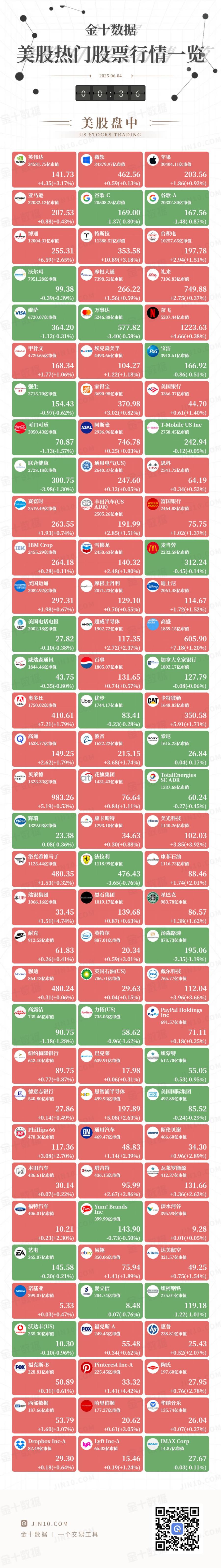 金十图示:2025年06月04日(周三)美股热门股票行情一览(美股盘中)