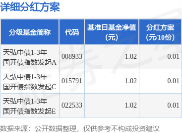 证券之星消息,12月3日发布《天弘中债1-3年国开行债券指数发起式证券投资基金分红公告》。本次分 红为2025年度的第4次分红。公告显示,本次分红的收益分配基准日为11月11日,详细分红方案如下: | 分级基金简称 | 代码 | 基准日基金净值 (元) | | 分红方案 (元/10份) | | | --- | --- | --- | --- | --- | --- | | 天弘中债1-3年 国开债指数发起A | 008933 | | 1.02 | | 0.01 | | 天弘中债1-3年 国开倩指数发起C | 015791 | | 1.02 | | 0.01 | | 天弘中债1-3年 国开倩指数发起E | 022533 | | 1.02 | | 0.01 | 以上内容为证券之星据公开信息整理,由AI算法生成(网信算备310104345710301240019号),不构成 投资建议。 本次分红对象为权益登记日在基金注册登记机构登记在册的本基金全体基金份额持有人。,权益登记日 为12月4日,现金红利发放日为12月5日。选择红利再投资方式的投资者,其红利按2025年12月04日除息 后的基金份额净值转换为基金份额,转 ...