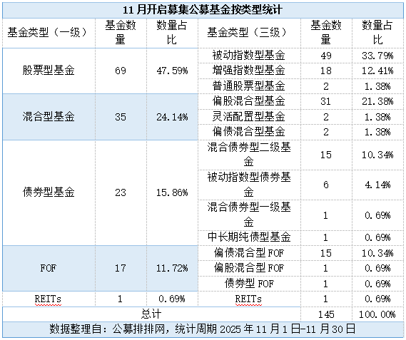 公募基金发行整体情况 - 2025年11月共有145只公募基金开启募集,较10月的136只环比增长6.62% [1] - 基金发行市场呈现回暖态势 [1] 基金类型分布 - 股票型基金发行69只,占比47.59%,为第一大基金类型 [2] - 混合型基金发行35只,占比24.14% [2] - 债券型基金发行23只,占比15.86% [2] - FOF基金发行17只,占比11.72% [2] - REITs发行1只,占比0.69% [2] 权益类基金发行 - 股票型基金和偏股混合型基金合计发行100只,占全月总发行量的68.97% [2] - 被动指数型基金发行40只,占全月基金发行总量的33.79%,在股票型基金中占主导地位 [2][3] - 增强指数型基金发行18只,占比12.41% [2][3] - 普通股票型基金仅发行2只,占比1.38% [2][3] 债券型基金发行 - 11月发行23只,较10月的14只环比大增64.29% [3] - 混合债券型二级基金发行15只,占债券型基金发行量的65.22%,反映“固收+”策略为主 [3] FOF基金发行 - 11月共发行17只,创下2025年年内单月新高,并刷新近31个月以来的单月发行纪录 [3] - 截至2025年11月30日,年内新成立FOF已达76只,超出去年全年的2倍 [3] - 年内FOF发行份额713.53亿份,创下近4年新高 [3] 主要公募机构发行情况 - 11月发行的产品来自于71家公募机构 [5] - 广发基金和易方达基金各发行9只公募基金,数量居首,且均以股票型ETF为主 [5] - 鹏华基金和中欧基金均发行6只公募基金,中欧基金发行的6只基金均为混合型基金 [5] - 富国基金、平安基金和天弘基金当月均发行5只基金 [5]