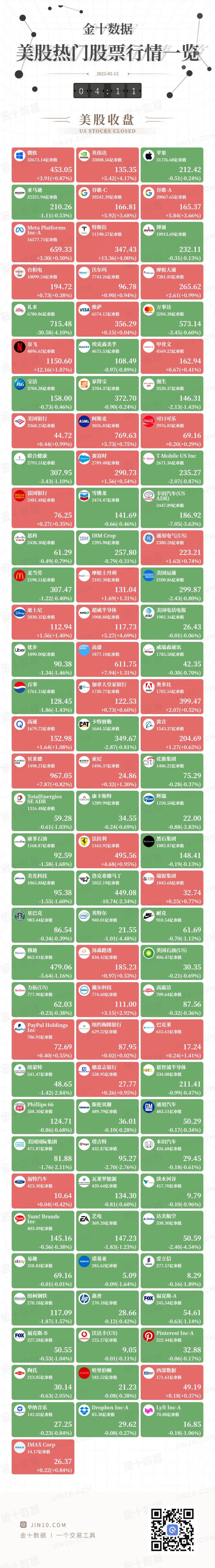 金十图示:2025年05月14日(周三)美股热门股票行情一览(美股收盘)