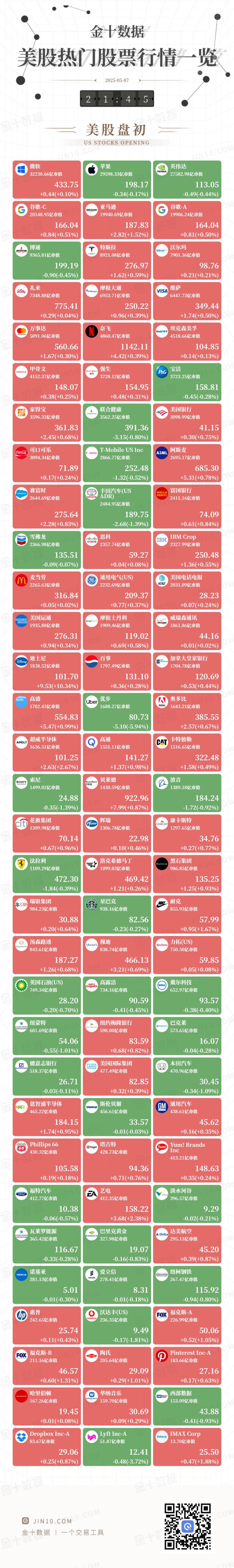 金十图示:2025年05月07日(周三)美股热门股票行情一览(美股盘初)