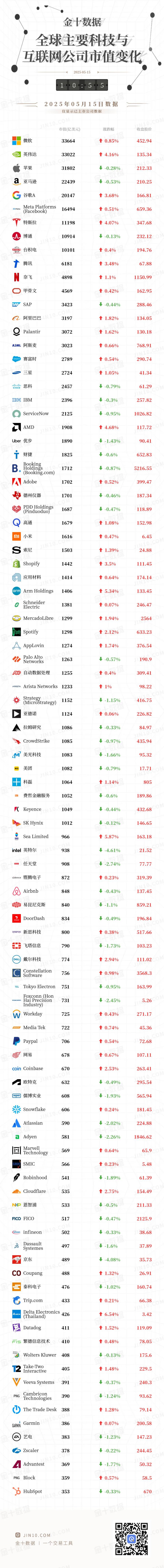 金十图示:2025年05月15日(周四)全球主要科技与互联网公司市值变化
