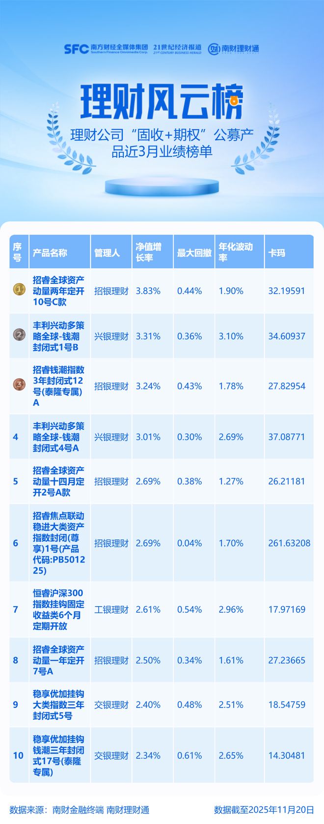行业整体表现 - 理财公司共存续208只公募“固收+期权”理财产品,近3个月平均净值增长率为1.92%,平均最大回撤为0.28% [5] - 全量“固收+期权”产品中仅1只近3月收益告负,为-0.34%,其余产品均实现正收益 [5] 领先产品及发行机构 - 收益前十榜单中,招银理财有5只产品上榜,兴银理财和交银理财各有2只产品入围,工银理财有1只产品上榜 [5] - 本期榜单有3只产品近3月净值增长率超3%,招银理财和兴银理财各占2只 [5] - 具体产品表现包括:招银理财“招睿全球资产动量十四月定开2号A款”近3月净值增长率2.69%,“招睿焦点联动稳进大类资产指数封闭(尊享)1号”净值增长率2.69% [3] - 工银理财“恒睿沪深300清水器勾固定收益类6个月定期开放”近3月净值增长率2.61% [3] - 交银理财“稳享优加挂钩大营营的三年封闭式5号”净值增长率2.40%,“稳享优加挂钩钱潮三年到闭式17号(泰隆专属)”净值增长率2.34% [3] 个案产品深度分析 - 工银理财“鑫悦私银尊享中证1000鲨鱼鳍策略固收封闭(25G6075B)”近3月净值增长率为-0.34%,是唯一收益为负的产品 [5] - 该产品成立于2025年5月8日,到期日为2026年2月3日,其业绩比较基准根据挂钩标的价格表现设定在年化1.15%至6.65%区间 [5][6] - 产品自成立以来出现两次明显净值回撤:2025年8月13日至20日累计净值从1.0167回落至1.0095,单周跌幅0.70%;11月5日至12日累计净值由1.0166降至1.0127 [6] - 截至2025年11月19日,产品成立以来年化收益率为2.47%,超出业绩比较基准下限 [8] - 2025年三季度产品组合配置固定收益类资产和挂钩中证1000指数的看涨鲨鱼鳍期权,报告期内挂钩标的收盘价格曾高于障碍价格(期初价格的120%) [8]