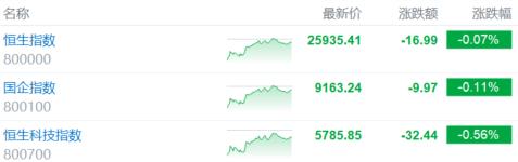 11月5日,午后港股市场明显回暖,恒生指数、国企指数一度转涨,最终分别收跌0.07%及0.11%,恒指在26000点附近反复震荡,恒生科技指数跌0.56%相对 最弱,三大指数均呈现低开高走行情。 | 名称 | | 最新价 | 涨跌额 | 涨跌幅 | | --- | --- | --- | --- | --- | | 恒生指数 | 11/2 | 25935.41 | -16.99 | -0.07% | | | Mit | | | | | | | 9163.24 | -9.97 | -0.11% | | 800100 | | | | | | 恒生科技指数 | waller | 5785.85 | -32.44 | -0.56% | | 800000 国企指数 800700 | | | | | | | ma | | | | | | AND | | | | | | Nisl | | | | 盘面上,大型科技股跌幅收窄但总体依旧弱势,电网、电气设备新能源午后拉升较为明显,航空股全天维持强势行情,铜、黄金等有色金属股反弹拉升,大 金融、银行股继续涨势,濠赌股、手游股、建材水泥股、家电股多数上涨。加密货币概念股全天弱势,教 ...