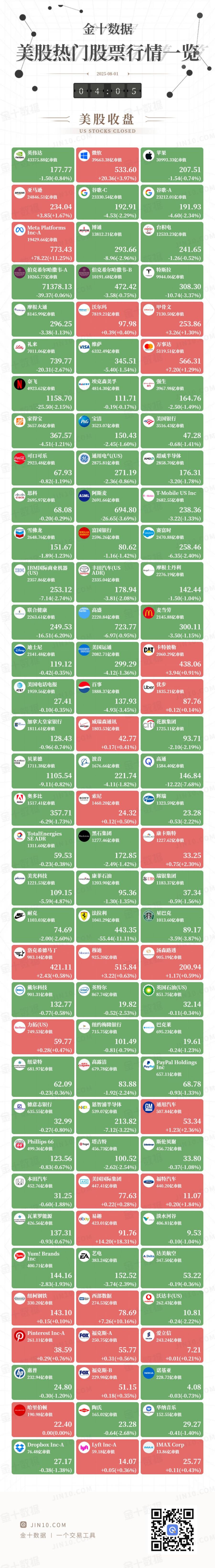 金十图示:2025年08月01日(周五)美股热门股票行情一览(美股盘初)