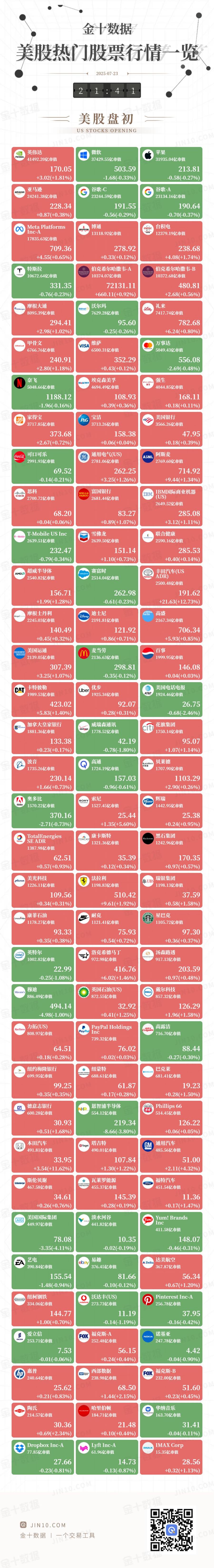 金十图示:2025年07月23日(周三)美股热门股票行情一览(美股盘初)