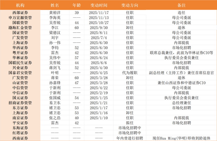 文章核心观点 - 证券行业首席信息官变动频繁且呈现年轻化、复合背景等趋势,其角色已从技术保障转变为数字化转型的战略决策者和价值创造驱动者 [1][2][6] - 行业正通过内部提拔、市场化招聘及母公司委派等多种方式积极配置首席信息官人才,同时金融科技领域招聘需求旺盛,聚焦前沿技术 [3][4][5] - 首席信息官在推动行业数智化转型中作用关键,但不同券商间在人才、技术落地及治理地位方面存在分化 [6][7] 首席信息官变动概况 - 年内有超过20家券商(含券商资管)发生首席信息官变动,数量较2024年同期(不足10家)已翻番 [2] - 变动原因除广发资管与渤海汇金资管的两人系到龄退休外,其余均为新任命 [3] - 券商资管是变动密集区,年内有10家券商资管发生首席信息官变动 [3] 首席信息官角色演变与要求 - 角色内涵实现“三个转变”:从“技术执行者”到“战略决策者”,从“技术单一维度”到“技术+业务”融合,从“保障系统稳定”到“驱动价值创造” [2] - 首席信息官是券商数字化转型的“掌舵人”,要求兼具技术视野与业务理解 [2][3] - 肩负“护航者、推动者、创新者”三重使命,推动券商从“数字化”迈向“智能化” [6] 人事任命特点与趋势 - **年轻化**:西部证券黄裕洋39岁连任,仍是年内公开年龄中最年轻者;国联资管吴哲锐、粤开证券雷杰、南京证券张之浩等均为40出头的“80后” [1][5] - **复合背景与内部提拔**:新任首席信息官多具“技术+业务”背景,如中信证券于新利拥有跨岗位业务管理经验;上海证券、兴业证券、南京证券等均为内部提拔 [3][5] - **市场化招聘**:国联民生资管吴哲锐、东方证券褚卫忠、华西证券李钧等通过市场化招聘上岗 [4] - **兼任与委派模式**:常见母公司首席信息官兼任资管子公司职务,如中信证券于新利;券商资管新任人选多为母公司委派 [3] 行业招聘与投入重点 - 秋招期间,金融科技是券商招聘重点,头部券商有扩招态势 [5] - 招聘岗位要求紧跟前沿技术,如华泰证券设金融科技专场,中信证券突出AI、QUANT和FinTech,中国银河证券要求熟悉深度学习框架与算法模型 [6] - 首席信息官受重视程度高,有4位首席信息官年薪超过300万元 [6] 当前挑战与分化 - 中小券商在数字化方向面临人才缺位挑战 [7] - 技术在优化风险控制的同时,也会催生新的风险类型 [7] - 部分券商信息化落地情况不够理想,首席信息官在公司治理体系中的地位依然不够高 [7]