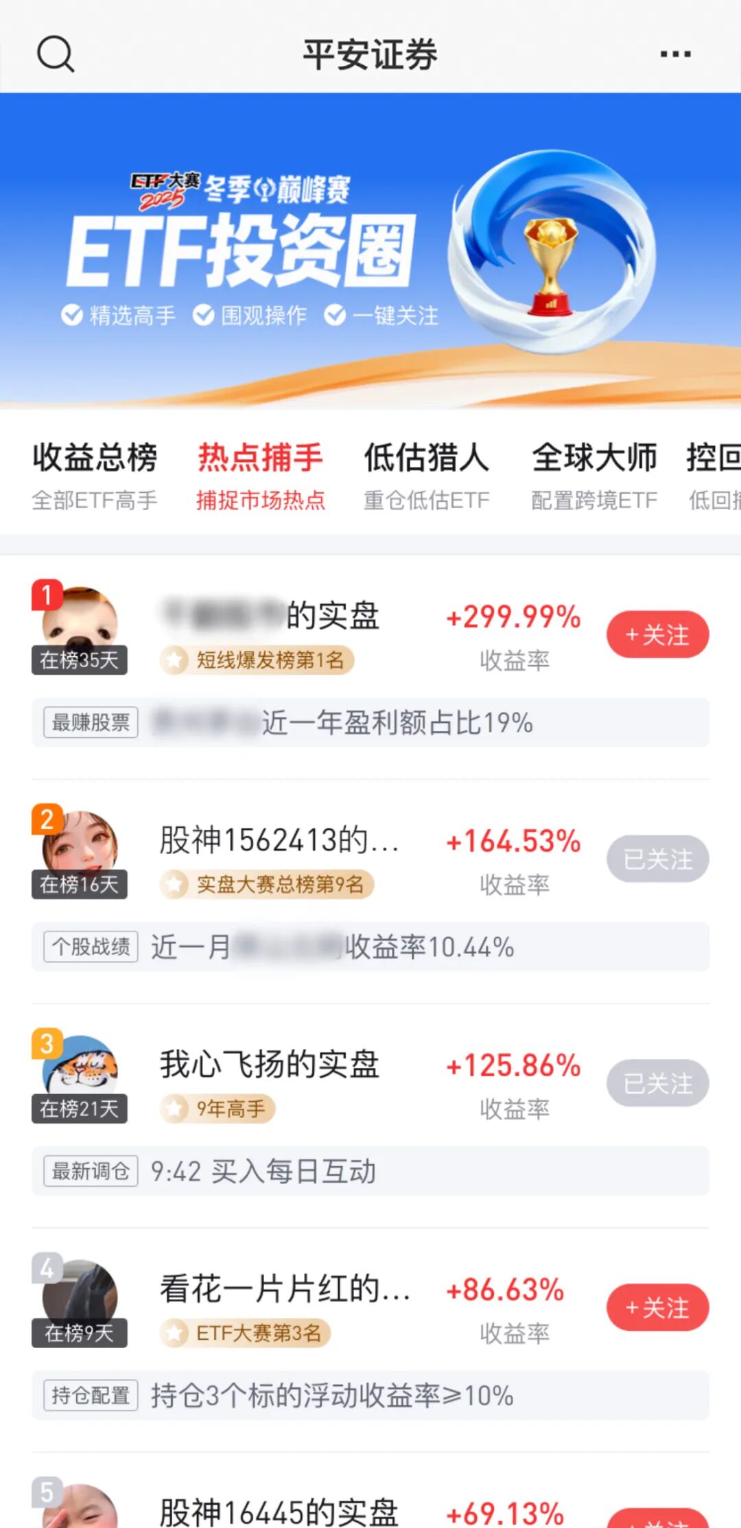 【导读】5万亿ETF市场迎变局,平安证券联手11家公募打造"投资圈",开启财富管理生态服务模式 随着国内ETF市场规模突破5万亿元大关,券商财富管理业务正从提供单一的"交易通道"向构建深度的"赋能生态"全面升级。12月15日,平安证券联合中 国基金报,携手易方达、招商等11家头部公募基金,正式推出"ETF冬季巅峰赛",并首次在业内上线"ETF投资圈"专区。此举被视为券商与公募机构深化 合作、共同构建财富管理新生态的重要尝试。 对于此次赛事,平安证券副总经理姜学红表示:"ETF不仅是居民资产配置的好工具,也是资本市场服务实体经济、支持国家战略的重要抓手。"当前,面 对数量众多的ETF产品,投资者面临的"选品难、拿不住"等痛点成为行业突围的关键,行业亟待从产品销售导向转向客户陪伴导向,提供覆盖投前、投 中、投后的全流程服务。 平安证券首推「四大策略圈子」:助力客户学投资 本次赛事以"找高手,加圈子"为主题,突破传统投资竞赛模式,在平安证券App上线全新的"ETF投资圈"页面,并依据策略类型划分出四大核心圈层 ——"低估猎手圈""控回撤高手圈""全球大师圈"及"热点捕手圈"。不同风险偏好与投资习惯的投资者可进入相应 ...