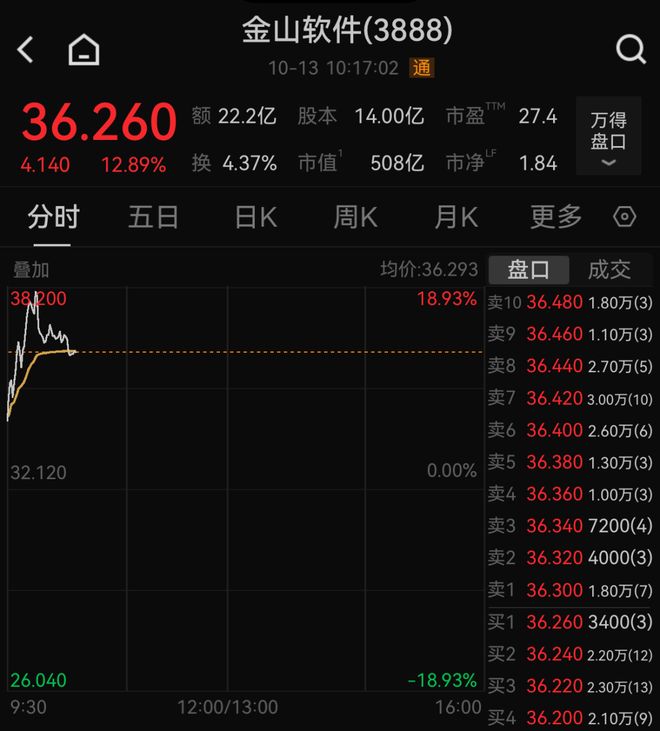 消息面上,日前,商务部发布公告,对含有中国成分的部分境外稀土相关物项实施出口管制。除管制规 则外,附件采用wps格式,申请文件须以中文提交两大细节引发热议。据悉,此前公告附件都是word或 pdf格式。 | ( 日 | 金山软件(3888) | | | | | --- | --- | --- | --- | --- | | | 10-13 10:17:02 通 | | | | | 36.260 | 额 22.2亿 股本 14.00亿 市盈 "" | | 27.4 | 力得 | | 4.140 12.89% | 换 4.37% 市值 508亿 市净 | | 1.84 | | | 分时 五日 | 日K | 周K | 申名 目K | | | 置加 | | | 均价:36.293 盘口 成交 | | | 38 200 | | | 18.93% 卖10 36.480 1.80万(3) | | | | | | 卖9 36.460 1.10万(3) | | | | | | 卖8 36.440 2.70万(5) 卖7 36.420 3.00万(10) | | | | | | 卖6 36.400 2.60万(6) | | | ...