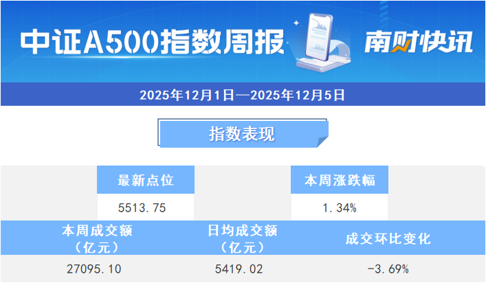 中证A500指数表现 - 指数于2025年12月5日收盘报5513.75点,本周上涨1.34% [2] - 本周日均成交额为5419.02亿元,单日成交额环比下降3.69% [5] 成分股表现 - **涨幅前十成分股**:航天发展(+52.26%)、杰瑞股份(+26.40%)、天孚通信(+25.79%)、江西铜业(+15.74%)、航天电子(+15.68%)、北京君正(+15.15%)、云铝股份(+14.62%)、铜陵有色(+14.51%)、西部矿业(+14.14%)、华润微(+13.76%)[3] - **跌幅前十成分股**:蓝色光标(-13.98%)、湖南裕能(-10.59%)、多氟多(-10.39%)、中公教育(-9.02%)、三六零(-8.88%)、雅化集团(-8.46%)、万科A(-7.99%)、容百科技(-7.94%)、捷成股份(-7.73%)、江特电机(-7.54%)[3] 相关ETF基金表现 - 本周40只中证A500基金全线收涨,除两只基金外,其余均涨超1% [6] - A500增强ETF易方达成为本周涨幅唯一超过2%的产品 [6] - 截至12月4日,相关基金总规模为1954.68亿元,已跌破2000亿元 [6] - **规模前三的基金**:华泰柏瑞A500ETF(262.17亿元)、易方达A500ETF(227.49亿元)、国泰基金中证A500ETF(222.06亿元)[4][6] 机构市场观点 - 渤海证券认为,当前A股进入震荡等待阶段,业绩真空期题材催化是重要线索,市场等待重要会议后的增量政策以展开反弹 [8] - **行业关注方向**: - TMT板块及机器人领域:基于AI资本开支扩张、算力国产替代加快及应用端催化 [8] - 电力设备及有色金属行业:基于全球储能高景气及固态电池产业化推进 [8] - 社会服务及资源品:基于政策聚焦调结构、“反内卷”带来的博弈性机会 [8] - 银行业:基于低利率环境及公募基金持仓向业绩基准回归 [8]