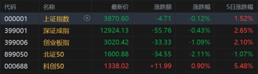A股三大指数今日集体冲高回落,集体收跌;截至收盘,沪指跌0.12%报3870点盘中一度刷新十年新高,深证成指跌0.43%,创业板指跌1.09%, 北证50指数跌2.11%。全天成交额2.55万亿元,较前一交易日增量837亿元。全市场近3400股下跌。本周,沪指累涨1.52%,深证成指累涨2.65%, 创业板指累涨2.1%。 | 代码 | 名称 | | 最新价 | 涨跌额 | 涨跌幅 | 5日涨跌幅 | | --- | --- | --- | --- | --- | --- | --- | | 000001 | 上证指数 | O | 3870.60 | 4.77 | -0.12% | 1.52% | | 399001 | 深证成指 | | 12924.13 | -55.76 | -0.43% | 2.65% | | 399006 | 创业板指 | | 3020.42 | -33.33 | -1.09% | 2.10% | | 899050 | 北证50 | | 1600.88 | -34.55 | 2.11% | -1.07% | | 000688 | 科创50 | | 1338.02 | +11.99 | 0 ...