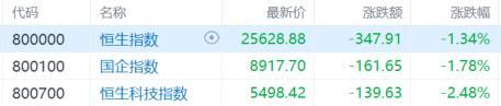 港股三大指数低开低走,午后跌幅持续扩大,市场情绪十分低迷。恒生科技指数跌幅最大,最终大幅收跌2.48%,恒生指数、国企指数分别下跌1.34%及 1.78%,恒指下挫近350点报25628点。 | 代码 | 名称 | | 最新价 | 涨跌额 | 涨跌幅 | | --- | --- | --- | --- | --- | --- | | 800000 | 恒生指数 | 0 | 25628.88 | -347.91 | -1.34% | | 800100 | 国企指数 | | 8917.70 | -161.65 | -1.78% | | 800700 | 恒生科技指数 | | 5498.42 | -139.63 | -2.48% | 盘面上,作为市场风向标的大型科技股集体下跌拖累大市低迷;半导体芯片股、生物医药股、机器人概念股、濠赌股、汽车股、苹果概念股纷纷走低,权重 股中芯国际跌超4%。另一方面,避险情绪升温,黄金价格逼近历史新高,黄金股全天强势,机构预计开门红新单保费和NBV将实现双位数增长,内险股集 体走高,消费利好政策持续推出,餐饮股、乳制品股等消费概念股走俏。 | 行业热力图 √ | 领涨板块 | | | ...