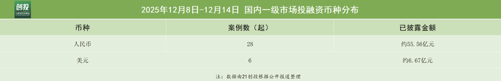 过去一周,科技与制造领域大额融资集中,半导体、机器人与生物医药赛道获资本重点布局,融资规模显著。 科技与制造行业仍是资本关注的核心,融资规模居于前列。半导体、人工智能与高端制造赛道热度突出,其中北京通嘉宏瑞完成超10亿元B+轮融资,杭州 云深处获超5亿元C轮投资,深圳新声半导体完成近3亿元C轮融资,凸显资本对半导体材料、机器人及核心零部件国产替代的持续看好。此外,北斗智联、 极佳视界等企业在智能网联与具身智能领域也获得数亿元级投资,进一步印证硬科技赛道的高景气度。 医疗健康领域同样涌现多笔大额融资,苏州圣因生物完成超1.1亿美元B轮融资,德昇济医药获1.08亿美元B轮投资,杭州圣域生物完成超亿元A轮融资,显 示资本市场对RNAi疗法、肿瘤精准治疗等前沿生物技术的高度关注。消费服务领域亦出现亮点,跨境支付平台空中云汇完成3.3亿美元G轮融资。整体来 看,硬科技与生物医药继续引领本周融资主线。 21创投不完全统计12月8日—12月14日,报告日期内国内一级市场发生融资事件41起。其中,有34笔融资披露了融资金额和币种信息,总规模约合人民币 103.58亿元人民币。 | 刨投 24重起的通信通 | | 2025年1 ...
