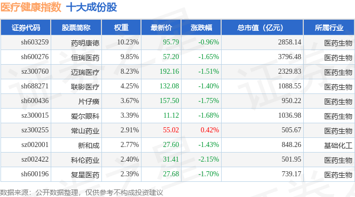 证券之星消息,1月27日,医疗健康(980016)指数报收于6173.05点,跌0.98%,成交328.35亿元,换手 率1.29%。当日该指数成份股中,上涨的有11家,三生国健以10.93%的涨幅领涨,下跌的有39家,华海 药业以3.79%的跌幅领跌。 医疗健康(980016)指数十大成份股详情如下: | 医疗健康指数 十大成份股 | | --- | | 证券代码 | 股票简称 | 权重 | 最新价 | 涨跌幅 | 总市值(亿元) | | 所属行业 | | --- | --- | --- | --- | --- | --- | --- | --- | | sh603259 | 药明康德 | 10.23% | 95.79 | -0.96% | | 2858.14 | 医药生物 | | sh600276 | 恒瑞医药 | 9.85% | 57.20 | -1.65% | | 3796.48 | 医药生物 | | sz300760 | 迈瑞医疗 | 8.23% | 192.16 | -1.51% | 4 | 2329.83 | 医药生物 | | sh688271 | 联影医疗 | 4.25% | 132.08 | ...