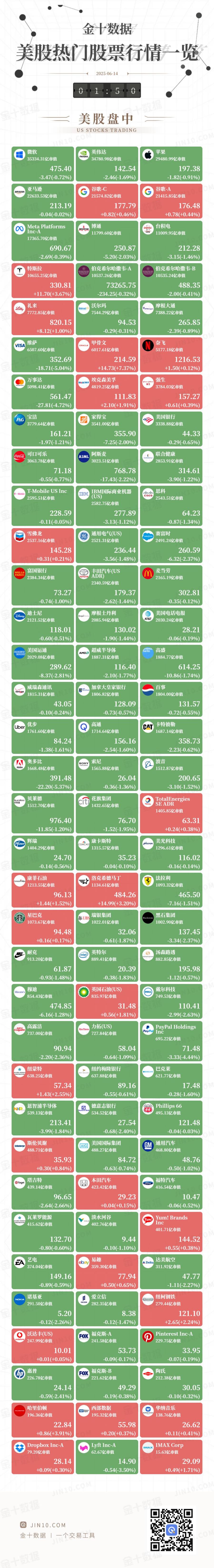 金十图示:2025年06月13日(周五)美股热门股票行情一览(美股盘中)