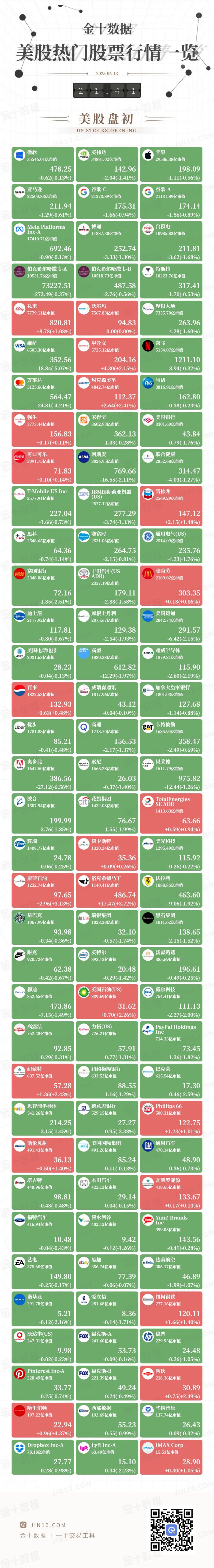 金十图示:2025年06月13日(周五)美股热门股票行情一览(美股盘初)