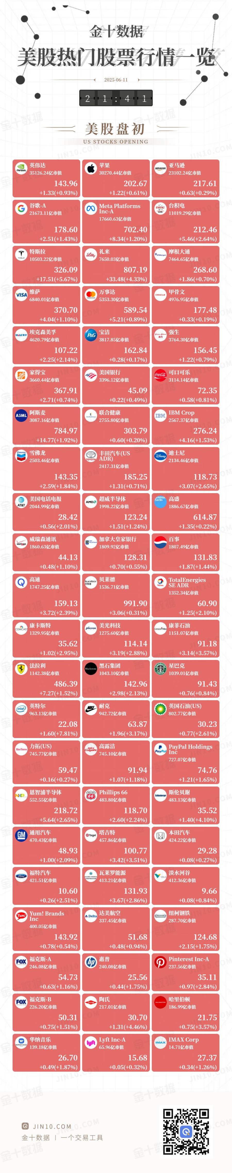 金十图示:2025年06月11日(周三)美股热门股票行情一览(美股盘初)