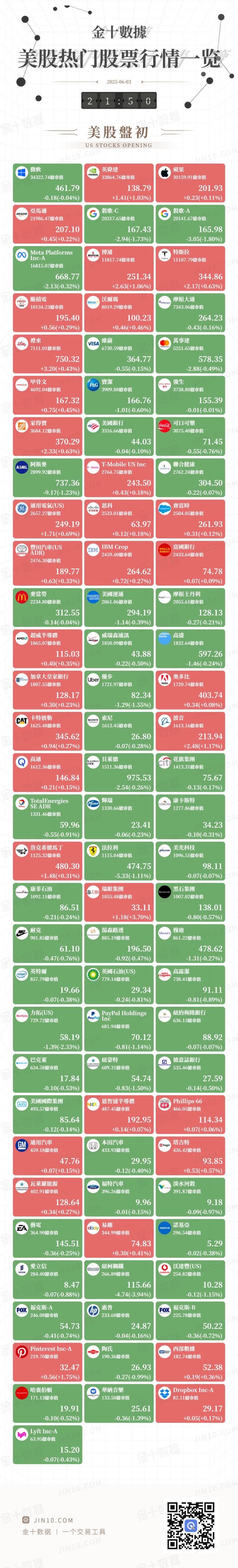 金十图示:2025年06月03日(周二)美股热门股票行情一览(美股盘初)