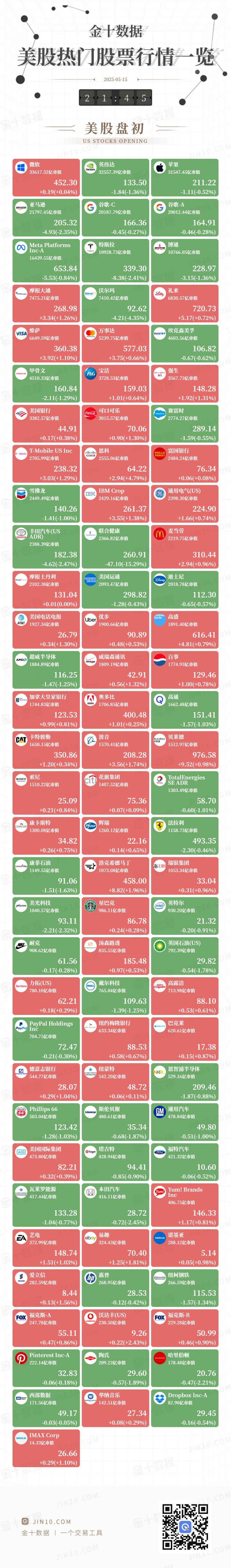 金十图示:2025年05月15日(周四)美股热门股票行情一览(美股盘初)