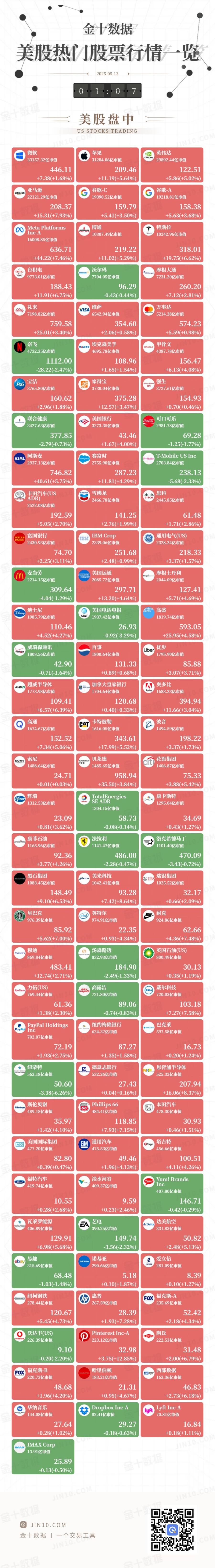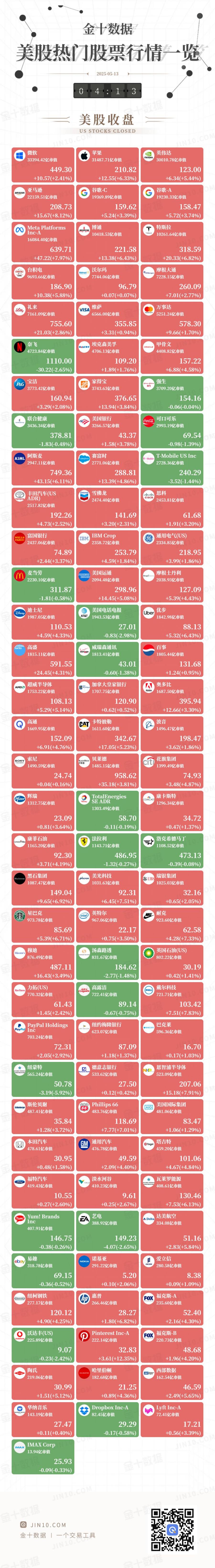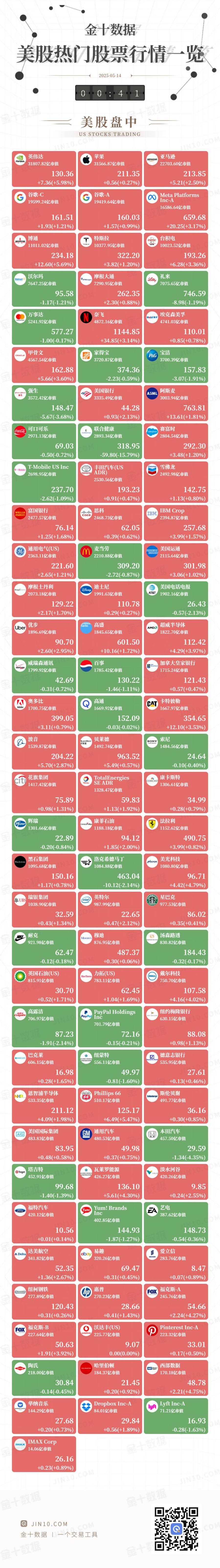 金十图示:2025年05月14日(周三)美股热门股票行情一览(美股收盘)