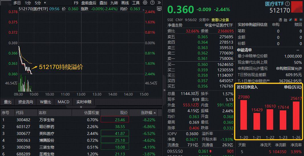 ETF盘中资讯|医疗再度走弱,512170续跌逾2%连失多根均线!成份股批量业绩预喜,逾10亿元资金坚定逆行