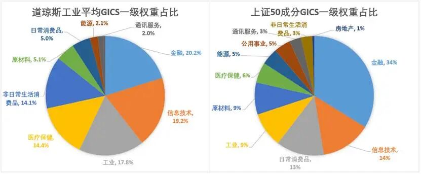 上周,我们对比了纳斯达克和港股中概互联的近三年的估值、基本面变化的差异情况。 如果说纳斯达克代表了增长的前沿,那么道琼斯工业平均指数和上证50,则更像是浓缩了中美经济最稳重最成熟的核 心标的,直接反映了两国经济的整体面貌。 在全球市场波动加剧的当下,观察这两大"基本盘"的定价逻辑与相对表现,或许能为我们理解市场提供更坚实的坐 标。 01 成分概况:上证50行业集中度更高,道琼斯行业分布更合理 行文伊始,按照惯例我们还是先来统一下数据对比的切口:以GICS行业分类口径梳理,目前道琼斯工业平均成分股有 30只,涉及GICS三级行业27个,成分股中仅有三个企业位于相同细分行业;而上证50成分股50只,涉及GICS三级行 业仅有26个,近半数成分股并不是成分中唯一同业标的。 从行业权重占比来看,以GICS一级行业权重占比来看,双方排名前二的权重均为金融和信息技术,只不过上证50的金 融类占比更高,达到了34%,而道琼斯工业平均的金融权重占比仅为20.2% 从细分行业权重来看更为明显,GICS三级行业中,上证50的集中度远高于道琼斯工业平均,商业银行占比接近20%。 这一点也能从两种指数的平均估值看出端倪,道琼斯工业指 ...