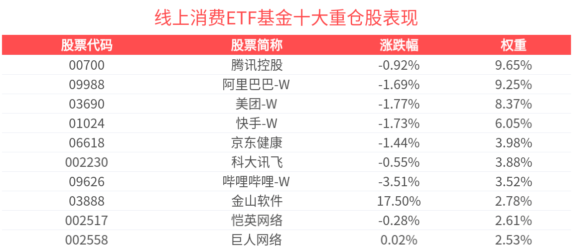 工业和信息化部等七部门近日联合印发《深入推动服务型制造创新发展实施方案(2025—2028年)》,提出加强新型信息基础设施建设,深化"5G+工业互联 网"融合创新和规模化应用,按需布局算力基础设施,加速算力与行业融合应用。提升工业数据要素供给,推动数据资源化、资产化和要素化,建设一批高 质量行业数据集。 截至2025年10月13日 09:45,中证沪港深线上消费主题指数(931481)下跌0.92%。成分股方面涨跌互现,金山软件(03888)领涨17.50%,吉比特(603444)上涨 1.79%,东华软件(002065)上涨1.60%;易点天下(301171)领跌3.88%,哔哩哔哩-W(09626)下跌3.51%,掌趣科技(300315)下跌3.32%。线上消费ETF基金 (159793)下跌0.62%,最新报价1.12元。拉长时间看,截至2025年10月10日,线上消费ETF基金近3月累计上涨21.04%。 线上消费ETF基金紧密跟踪中证沪港深线上消费主题指数,中证沪港深线上消费主题指数从内地与香港市场中选取50只主营业务涉及线上购物、数字娱乐、 在线教育以及远程医疗等领域上市公司证券作为指数样本,以反 ...