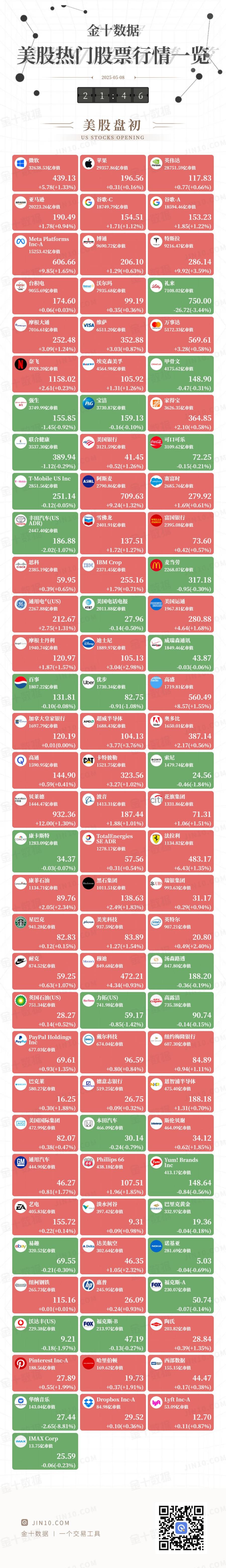 金十图示:2025年05月08日(周四)美股热门股票行情一览(美股盘初)