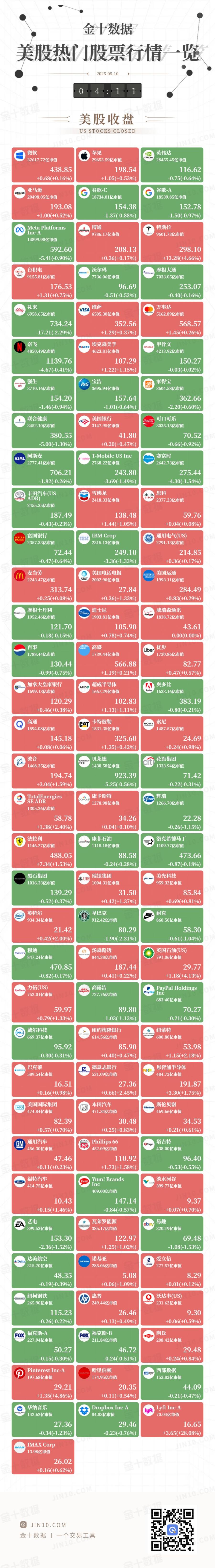 金十图示:2025年05月09日(周五)美股热门股票行情一览(美股收盘)