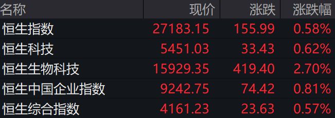 市场指数表现 - 2月10日香港恒生指数收于27183.15点,上涨155.99点,涨幅0.58% [1][2] - 恒生科技指数收于5451.03点,上涨33.43点,涨幅0.62% [1][2] - 恒生生物科技指数收于15929.35点,上涨419.40点,涨幅2.70% [2] - 恒生中国企业指数收于9242.75点,上涨74.42点,涨幅0.81% [2] - 恒生综合指数收于4161.23点,上涨23.63点,涨幅0.57% [2] 科技与互联网板块 - 科网股多数上涨,地平线机器人-W上涨3.75%,收于8.570港元 [2][3] - 商汤-W上涨2.52%,收于2.440港元 [2][3] - 比亚迪股份上涨2.41%,收于95.800港元 [2][3] - 京东集团-SW上涨1.95%,收于110.000港元 [2][3] - 中芯国际上涨1.71%,收于71.550港元 [2][3] - 阿里巴巴-W上涨1.65%,收于160.500港元 [2][3] - 小米集团-W上涨1.08%,收于35.580港元 [2][3] - 快手-W上涨1.59%,收于70.400港元 [3] - 百度集团-SW上涨0.84%,收于143.400港元 [3] - 网易-S上涨0.89%,收于193.000港元 [3] 传媒与娱乐板块 - 传媒板块大涨,数字王国上涨29.31%,收于0.375港元 [3][4] - 阅文集团上涨15.41%,收于43.580港元 [3][4] - 大麦娱乐上涨6.12%,收于1.040港元 [3][4] - 毛记葵涌上涨21.92%,收于0.890港元 [4] - 万咖膏联上涨20.00%,收于1.560港元 [4] - 中国国家文化产业上涨18.18%,收于0.780港元 [4] - 中国儒意上涨5.63%,收于2.250港元 [4] - 柠萌影视上涨5.42%,收于3.500港元 [4] 医药生物板块 - 医药生物板块活跃,复旦张江上涨6.73%,收于3.330港元 [4][5] - 石药集团上涨5.52%,收于10.320港元 [4][5] - 信达生物上涨4.98%,收于89.650港元 [4][5] - 药明生物上涨4.65%,收于40.020港元 [4][5] - 药明康德上涨逾4% [4] - 宝济药业-B上涨10.88%,收于143.700港元 [5] - 华花生物-B上涨9.24%,收于10.290港元 [5] - 英矽智能上涨7.59%,收于72.250港元 [5] - 复宏汉霖上涨7.31%,收于71.950港元 [5] 其他个股表现 - 美的集团上涨1.82%,收于89.750港元 [3] - 联想集团上涨1.74%,收于9.350港元 [3] - 零跑汽车上涨1.32%,收于44.500港元 [3] - 理想汽车-W上涨1.18%,收于72.800港元 [3] - 乐欣户外首日上市涨超102% [5]
