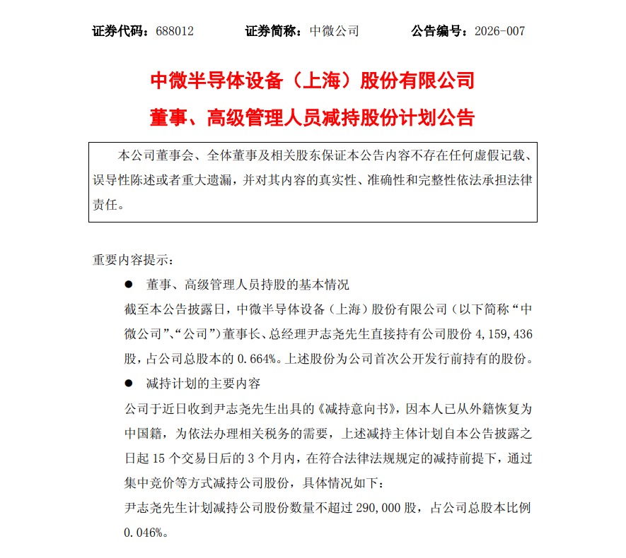核心事件:董事长尹志尧计划减持股份 - 公司董事长、总经理尹志尧计划减持不超过29万股公司股份,占公司总股本比例0.046% [1] - 减持方式为集中竞价,减持期间为2026年1月30日至2026年4月29日,拟减持股份来源为IPO前取得 [4] - 截至1月9日收盘,公司股价为336.68元/股,总市值为2108亿元,按此计算拟减持股票市值约为9764万元 [4] 减持原因与背景 - 尹志尧本次减持原因为“因本人已从外籍恢复为中国籍,为依法办理相关税务的需要” [1][4] - 公司2022年年报显示尹志尧为美国国籍,2024年年报中其国籍已变更为中国国籍 [7][9] - 2023年年报未披露尹志尧国籍,2025年第三季度报告中其称谓已变为“尹志尧先生”,并标注为中国国籍 [8][10] 公司近期经营业绩 - 2025年前三季度,公司实现营业收入80.63亿元,同比增长46.40% [10] - 2025年前三季度,公司实现归属于上市公司股东净利润12.11亿元,同比增长32.66% [10] 董事长尹志尧个人背景 - 尹志尧出生于1944年,拥有中国科学技术大学学士学位和加州大学洛杉矶分校博士学位 [6] - 其在硅谷拥有近二十年半导体行业资深经验,曾就职于英特尔、泛林半导体和应用材料公司,在应用材料期间获得86项美国专利和200多项国际专利 [6] - 2004年,时年60岁的尹志尧回国创业,创立了中微公司,现任公司董事长、总经理及核心技术人员 [6][9][10] - 公司主要从事高端半导体设备及泛半导体设备的研发、生产和销售 [6]
