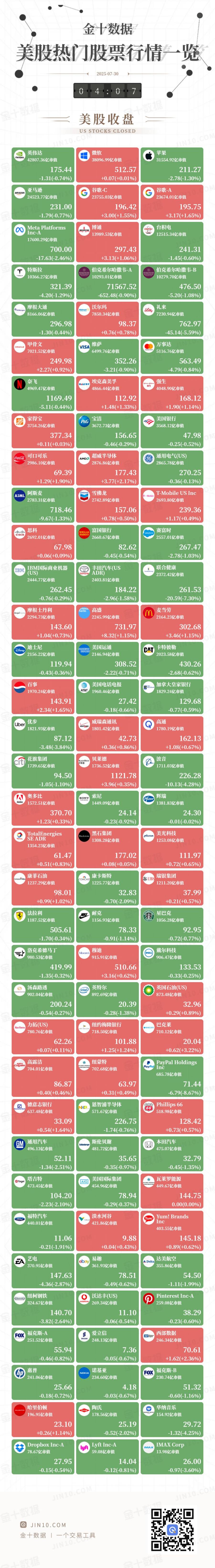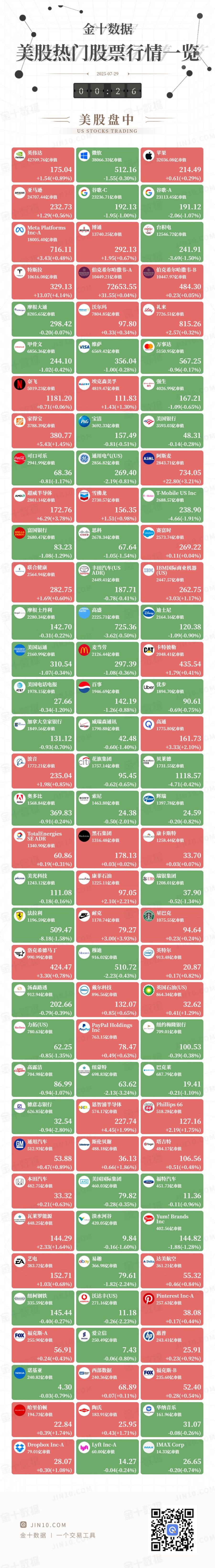 金十图示:2025年07月29日(周二)美股热门股票行情一览(美股收盘)