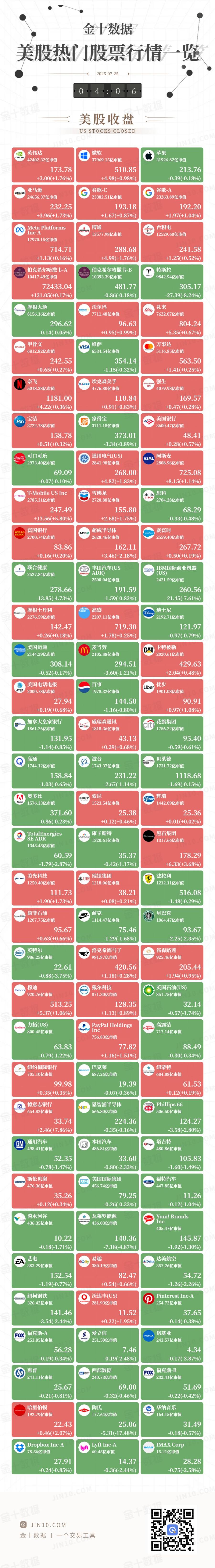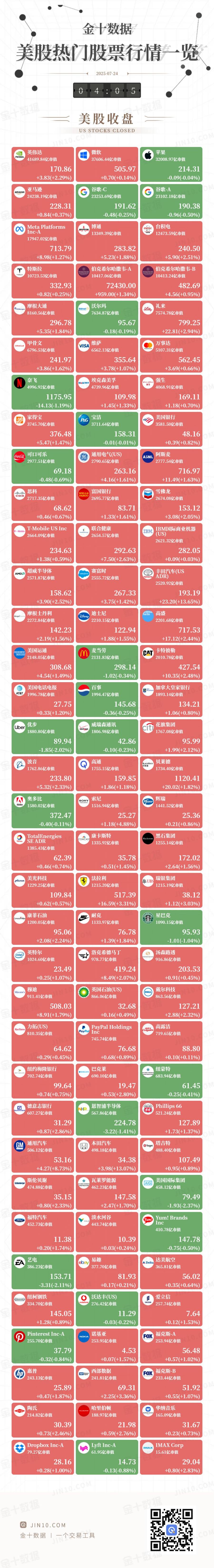 金十图示:2025年07月24日(周四)美股热门股票行情一览(美股收盘)