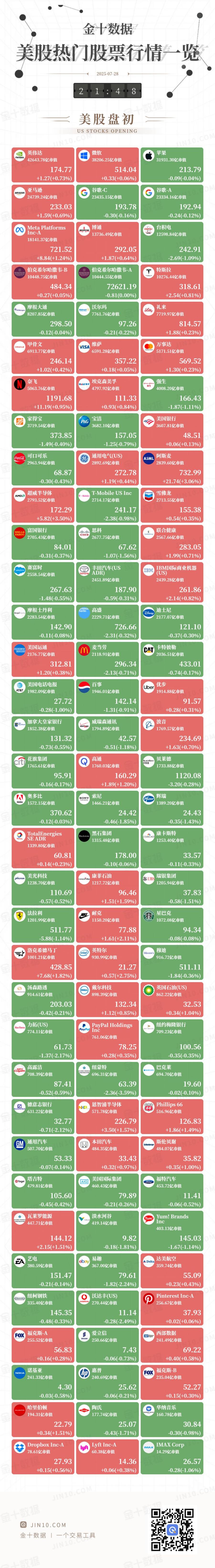 金十图示:2025年07月28日(周一)美股热门股票行情一览(美股盘初)