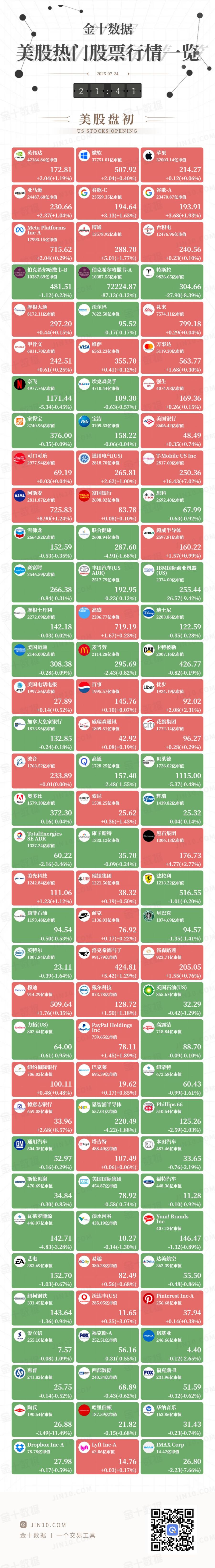 金十图示:2025年07月24日(周四)美股热门股票行情一览(美股盘初)