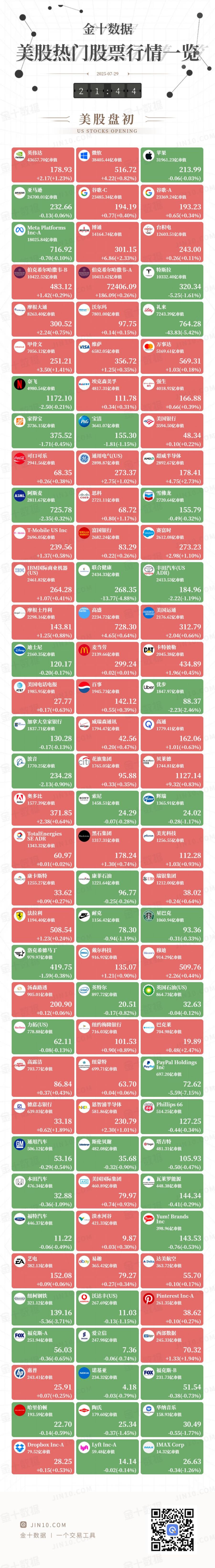 金十图示:2025年07月29日(周二)美股热门股票行情一览(美股盘初)