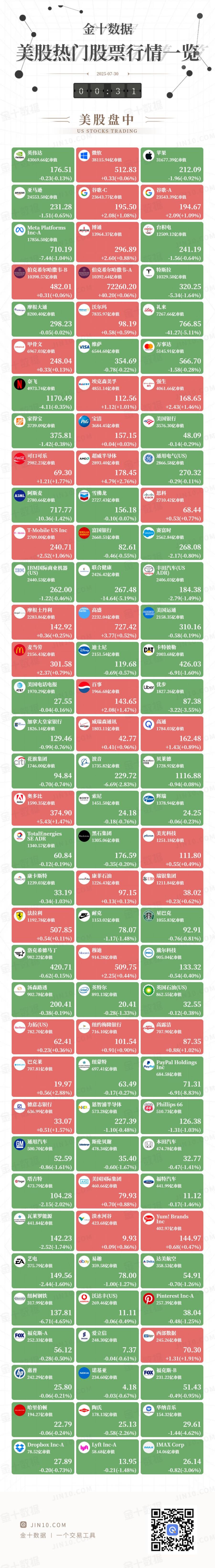 金十图示:2025年07月29日(周二)美股热门股票行情一览(美股盘中) @ JIN10.COM 金十数据 | 一个交易工具 t of the station of the subject of the 8200.40亿市值 835.97亿市值 7267.66亿市值 298.23 98.19 766.85 +0.58(+0.59%) -41.27(-5.11%) -0.05(-0.02%) 甲骨文 万事达 VISA 维萨 6967.03亿市值 6544.60亿市值 5145.91亿市值 566.70 248.04 354.69 +0.33(+0.13%) -0.78(-0.22%) -1.58(-0.28%) 埃克森美孚 强生 奈长 4973.74亿市值 4851.14亿市值 4061.66亿市值 1170.49 112.56 168.65 -4.11(-0.35%) +1.12(+1.01%) +2.43(+1.46%) 美国银行 s 家得宝 P&G 宝浩 171 3739.09亿市值 3684.45亿市值 3576.30亿市值 375.81 157.15 48.09 -1.42(-0.38%) +0.04 ...