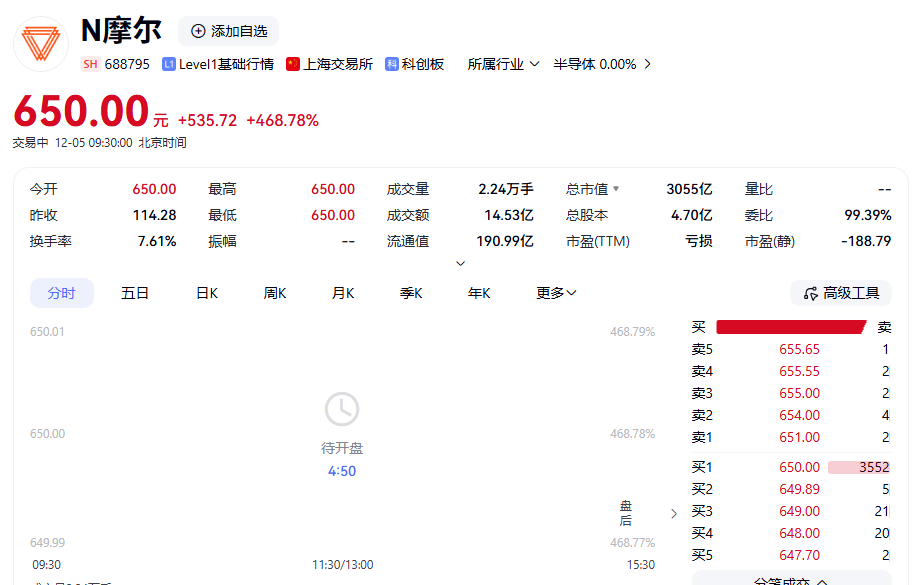 记者丨李益文 编辑丨叶映橙 2025年12月5日,A股三大指数开盘涨跌不一,汽车拆解、玻纤、HBM等板块指数涨幅居前, 有色·锑、林业、铁矿石等板块指数跌幅居前。 被誉为"国产GPU第一股"的摩尔线程正式登陆科创板,首日高开表现亮眼,市值达3055亿元, 成为科创板第4大芯片股,报650元/股,较114.28元/股的发行价 上涨468.78%。 以此计算,中一签投资者盈利近27万元,超越今年7月上市的同宇新材,登顶年内最赚钱新股 宝座。 这一亮眼表现的背后,是其创纪录的发行规模与市场狂热的认购氛围。公开资料显示,摩尔线 程此次IPO从受理到过会仅用时88天,创下科创板审核最快纪录,其114.28元/股的发行价创下 2025年A股新股发行价新高。 | | | | 2025年上市新股"肉签"前20 | | | | --- | --- | --- | --- | --- | --- | | 证券名称 | 发行价(元) | 上市首日 | 上市首日 | 第一任 市直昌最高可赚 | 泉景资金 | | | | 最高价(元) | 涨跌幅(%) | | 净额(亿元) | | | | | | (元) | | | 摩尔线程 | 1 ...