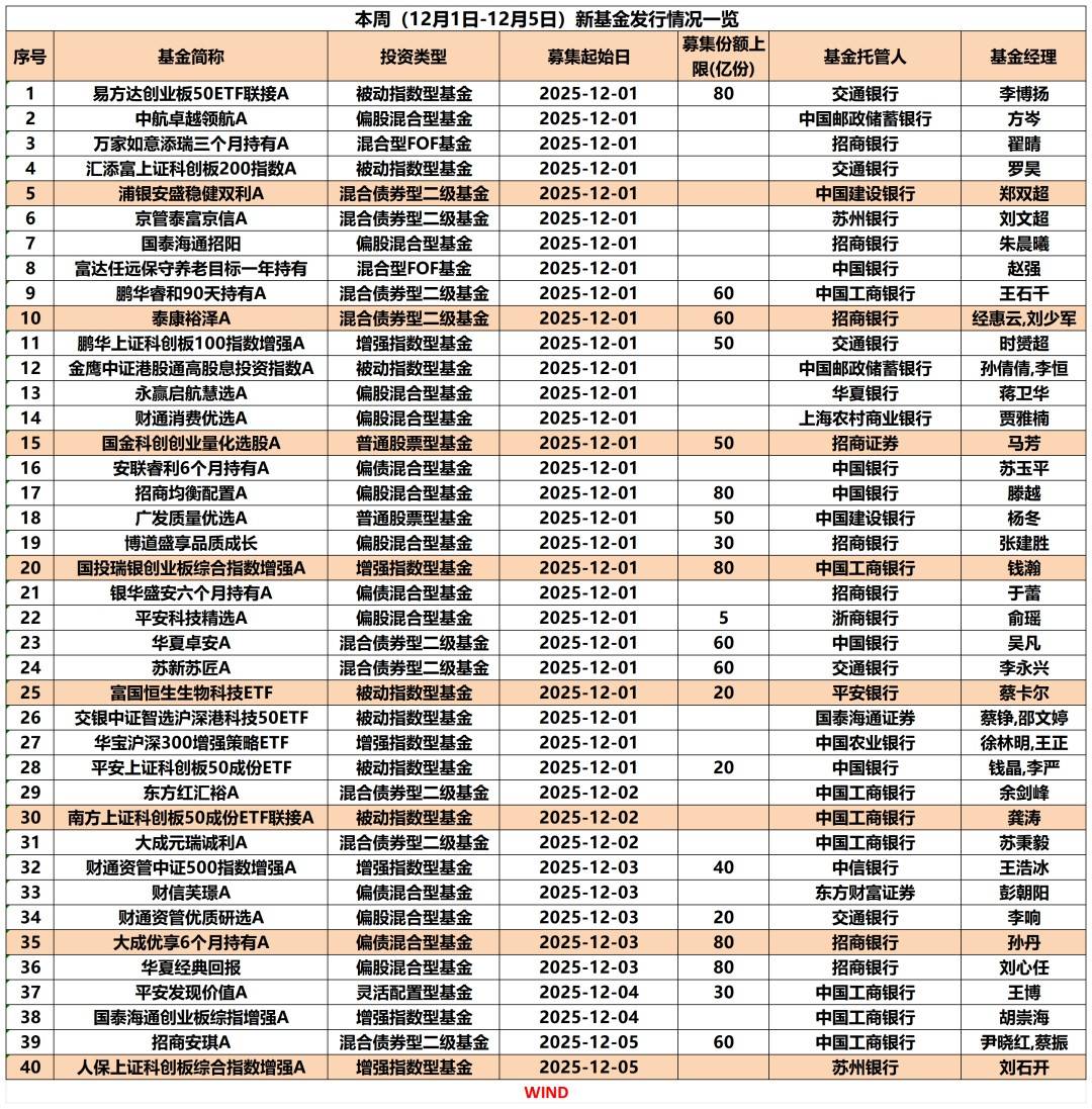 基金发行市场动态 - 12月首周新基金发行密集,共有40只新基金扎堆上市,仅12月1日当天就有28只同时开售 [1] - 多家大型基金公司参与发行,包括永赢、财通、招商、广发等,其明星基金经理也纷纷出马 [1] - 新发基金类型多样,包括被动指数型、偏股混合型、混合债券型二级、增强指数型、FOF等 [2] - 部分新设基金设有募集份额上限,例如易方达创业板50ETF联接A上限为80亿份,鹏华睿和90天持有A上限为60亿份,鹏华上证科创板100指数增强A上限为50亿份 [2] - 基金托管人涵盖各大商业银行及部分券商,如交通银行、招商银行、中国工商银行、中国银行等 [2] 近期新成立基金概况 - 在11月24日至11月28日当周,共有36只新基金成立 [11] - 新成立基金募集规模差异显著,最高为汇添富稳颐优选A,募集24.99亿份,最低为中金恒宁A,仅募集0.10亿份 [11] - 基金认购天数从最短1天到最长71天不等,显示市场认购热度分化 [11] - 成立基金的投资类型以被动指数型、混合债券型二级和偏股混合型为主 [11] - 部分基金聚焦于特定主题或指数,如红利低波动、港股通、科技成长、电网设备、科创板等 [11] 市场行为与投资者认知 - 历史经验表明,在牛市行情中,多数普通投资者难以将账面盈利转化为实际收益,往往经历“过山车”行情 [3] - 普通投资者常因人性弱点(盈利时怕回吐、亏损时不舍割肉)而做出非理性决策,导致赚小钱、亏大钱 [6] - 股价波动背后存在机构资金的有意图行为,例如“游资抢筹”和“机构震仓” [8] - 普通投资者因无法洞察资金真实意图,往往在机构洗盘时被震出局,拿不住优质股票 [8] - 量化分析能够将资金博弈行为转化为可视化的交易信号,辅助投资者识别“震仓”后的“抢筹”机会 [10] 投资策略与市场启示 - 通过量化策略把握从“机构震仓”到“游资抢筹”间的机会,在案例股票的五次操作中实现了累计63.36%的收益,效率接近全程持有 [10] - 年底基金密集发行并重点布局科技、消费、人工智能等领域,与近期市场主线吻合,表明专业机构正在捕捉相关机会 [10] - 对于普通投资者而言,理解资金真实动向比单纯追逐热点股票或新基金更为重要 [11] - 改变看待市场的方式,利用量化数据洞察资金行为,是打破“牛市不赚钱”困境的关键 [12]