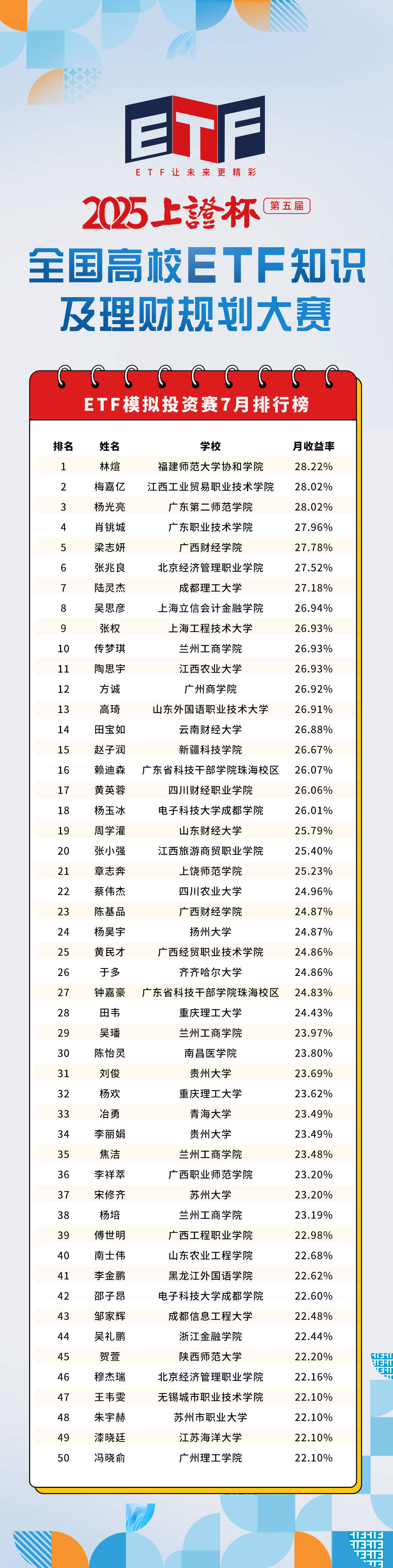 近日,2025"上证杯"ETF模拟投资赛7月排行榜揭晓:福建师范大学协和学院林煊、江西工业贸易职业技术学院梅嘉亿、广东第二师范学院杨光亮分获ETF模 拟投资赛7月排名前三甲,7月排名前50位选手月收益率均超20%。 近日,2025"上证杯"ETF模拟投资赛7月排行榜揭晓:福建师范大学协和学院林煊、江西工业贸易职业技术学院梅嘉亿、广东第二师范学院杨光亮分获ETF模 拟投资赛7月排名前三甲,7月排名前50位选手月收益率均超20%。 据主办方介绍,8月,2025"上证杯"已进入半决赛,但全国学子参赛热情不减:根据比赛规则,参赛选手可在10月底前继续角逐线上知识竞赛全国TOP100和 ETF模拟投资赛月榜TOP50,赢取奖金、证书、实习机会等赛事奖励。 | 4 | 肖挑城 | 广东职业技术学院 | 27.96% | | --- | --- | --- | --- | | 5 | 梁志妍 | 广西财经学院 | 27.78% | | 6 | 张兆良 | 北京经济管理职业学院 | 27.52% | | 7 | 陆灵杰 | 成都理工大学 | 27.18% | | 8 | 吴思彦 | 上海立信会计金融学院 | 26.94% | ...