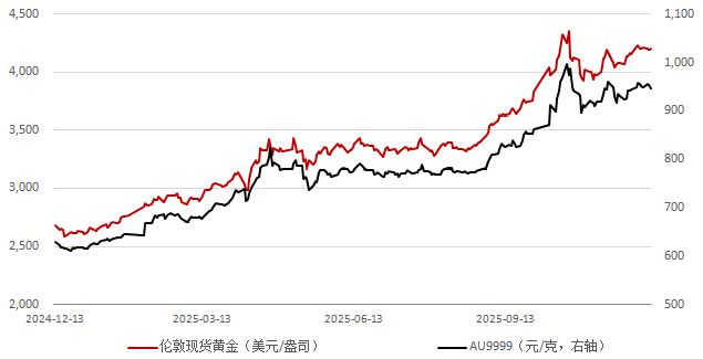 贵金属及商品市场表现 - 国际金价周二震荡收涨,伦敦现货黄金开盘报4190.11美元/盎司,最高上行至4221.40美元/盎司,最低下探至4169.85美元/盎司,最终报收于4206.59美元/盎司,较前日上涨0.40% [1][8] - COMEX黄金期货报4236.60美元/盎司,较前日上涨0.45% [8][9] - 其他贵金属表现强劲,伦敦现货白银昨涨跌幅为4.33%,年初至今涨幅高达109.97%;伦敦现货铂和钯分别上涨2.27%和2.17%,年初至今涨幅分别为86.83%和65.88% [9] - 国内黄金市场表现分化,上金所Au9999收盘价报947.13元/克,较前日下跌0.73%;上期所黄金期货主力合约收盘报951.54元/克,较前日结算价下跌0.92% [10][11] - 全球最大黄金ETF SPDR持仓量为1,047.97吨,较上周持仓1,050.25吨略有减少 [12][13] - 基本金属及原油表现不一,LME铜、铝、锌昨日分别下跌1.42%、1.47%和1.03%,但过去一周均录得上涨;NYMEX原油昨日下跌0.83%至58.39美元/桶 [9] 利率与汇率市场动态 - 中国央行周二开展1173亿元7天逆回购操作,当日有1563亿元逆回购到期,实现单日净回笼390亿元 [1][13] - 人民币汇率基本稳定,在岸人民币对美元收盘报7.0693,较上一交易日涨20个基点;人民币对美元中间价报7.0773,较上一交易日调贬9个基点 [1][18] - 美元指数上涨0.14%,报99.2407 [1][18][19] - 主要货币对中,美元兑日元上涨0.6144%至156.89,欧元兑美元和英镑兑美元分别微跌0.0859%和0.1726% [19] - 中美利差显著,10年期美债收益率报4.18%,10年期中债收益率报1.84% [17][18] - 中国银行间市场资金面平稳,Shibor隔夜品种报1.303%,7天期品种报1.431% [14] 权益市场与黄金股票 - 美国三大股指涨跌不一,道指下跌0.38%,标普500指数下跌0.09%,纳指上涨0.13% [20][21] - A股主要股指全线收跌,上证综指和深证成指分别下跌0.37%和0.39%,创业板指逆势上涨0.61% [20][21] - 国内外黄金股票指数表现强劲,美国黄金股票指数年初至今上涨113.57%,国内黄金股票指数年初至今上涨90.27% [22] - 具体黄金公司股票中,巴里克黄金昨日上涨2.22%,年初至今涨幅高达169.51%;国内紫金矿业、山东黄金、中金黄金昨日分别下跌3.49%、2.80%和4.65%,但年初至今涨幅均超过54% [22] 核心宏观驱动因素 - 美国就业市场数据强劲,截至11月22日的四周内,美国私营雇主平均每周新增4750个就业岗位,结束了此前连续四周的就业流失;美国10月JOLTS职位空缺达767万人,远超预期的711.7万人 [1][23] - 市场对美联储大幅降息的预期升温,美国总统特朗普表示将把支持立即大幅降息作为选择新任美联储主席的“试金石”,并可能通过调整关税政策帮助降低部分商品价格;前白宫经济顾问哈塞特称美联储有充足空间大幅降息 [1][23] - 在上述市场宽松预期推动下,国际金价震荡收涨 [1][23]