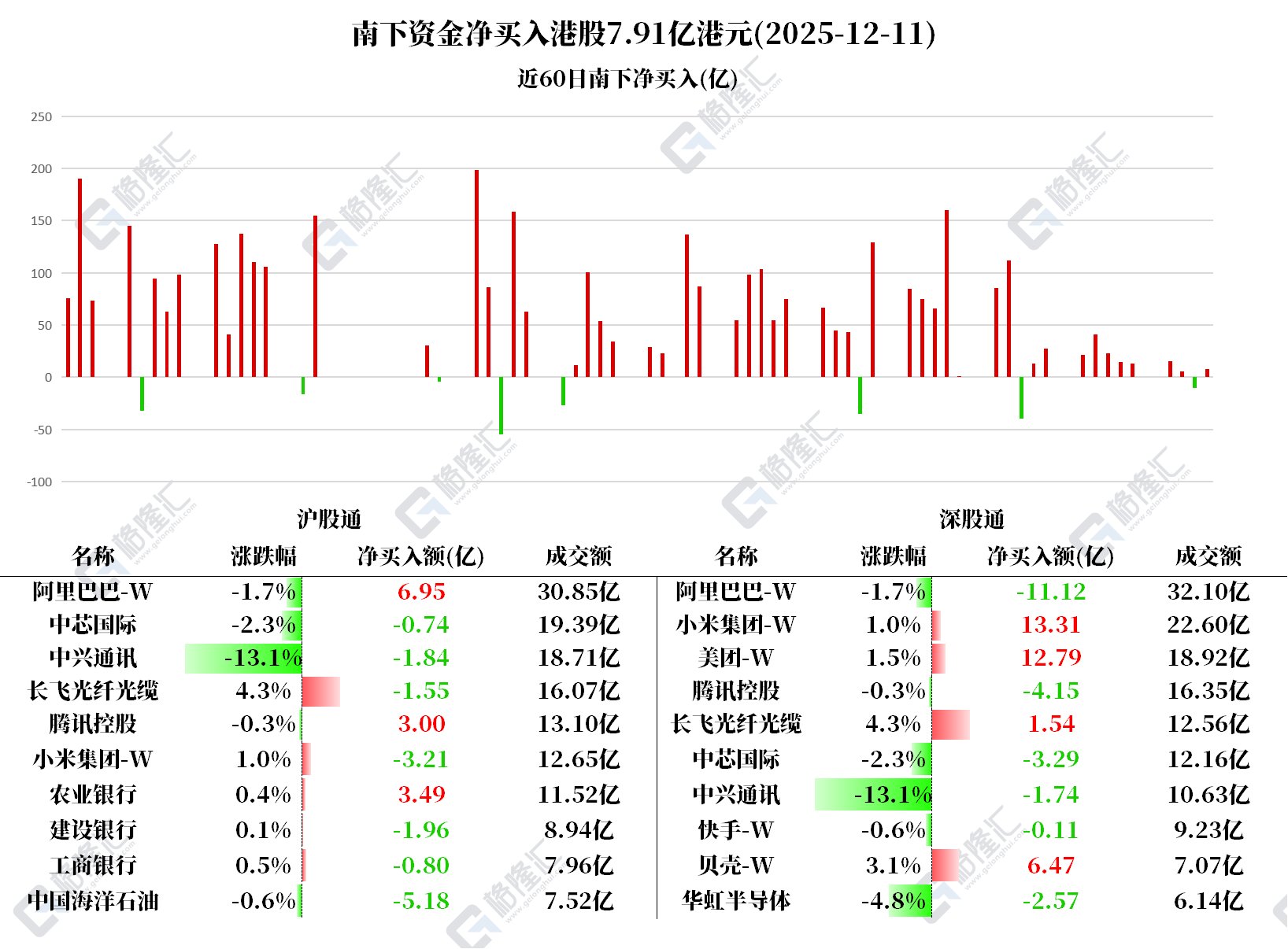 净卖出中国海洋石油5.17亿、阿里巴巴-W 4.17亿、中芯国际4.03亿、中兴通讯3.58亿、华虹半导体2.57亿、建设银行1.96亿、腾讯控股1.15亿。 格隆汇12月11日|南下资金今日净买入港股7.91亿港元。其中: 净买入美团-W 12.79亿、小米集团-W 10.09亿、贝壳-W 6.47亿、农业银行3.48亿; 据统计,南下资金已连续10日净买入小米,共计84.0743亿港元;连续4日净买入农业银行,共计13.4172亿港元;连续3日净卖出中芯国际,共计9.7263亿港 元。(格隆汇) | 名称 | 沪股通 涨跌幅 | 净买入额(亿) | 成交额 | 名称 | | --- | --- | --- | --- | --- | | 阿里巴巴-W | -1.7% | 6.95 | 30.85 Z | 阿里巴巴-W | | 中芯国际 | -2.3% | -0.74 | 19.39 Z | 小米集团-W | | 中兴通讯 | -13.1% | -1.84 | 18.71亿 | 美团-W | | 长飞光纤光缆 | 4.3% | -1.55 | 16.07亿 | 腾讯控股 | | 腾讯控股 | -0.3% | ...