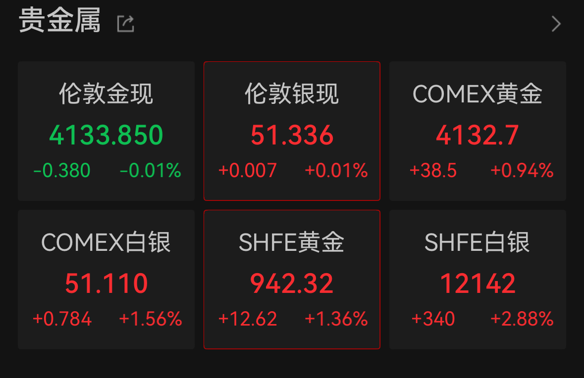 黄金价格表现 - 受美联储12月降息预期升温影响 国际黄金价格反弹至4100美元/盎司以上 [1] - 沪金期货价格上涨1.36% 沪银期货价格涨幅扩大至2.88% [1] 贵金属板块表现 - A股贵金属板块指数大幅上涨2.98% 板块内11只个股全部上涨 [3] - 晓程科技股价上涨超过4% 中金黄金 西部黄金 招金黄金股价均上涨超过3% [3] 市场观点与驱动因素 - 市场机构认为美联储官员释放鸽派信号使12月降息25个基点的预期重新升温 为金银价格提供重要支撑 [3] - 中信期货预计短期黄金价格将在4000美元/盎司至4200美元/盎司区间震荡整理 [3] - 风险资产回暖削弱黄金避险需求 但持续的地缘事件为价格底部提供支撑 [3] - 在美国补发数据前 市场进入"等待区间" 贵金属方向性驱动不足 [3]